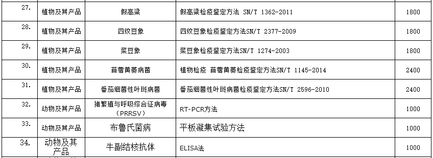 表一 微生物、转基因、动物源性、植检、动检、铁矿石项目及费用